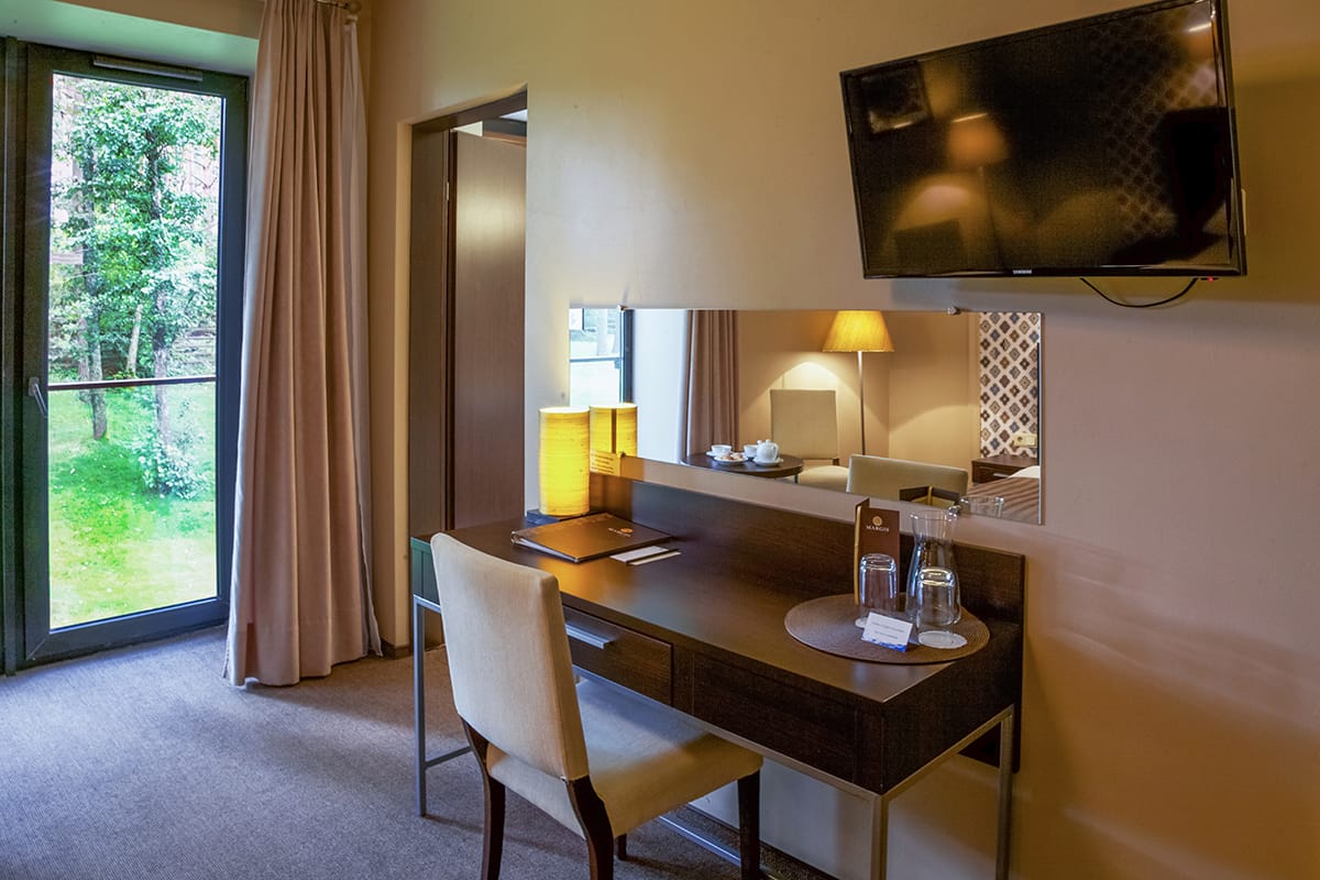 Įspūdingi, erdvūs kambariai, pro kurių langus atsiveria Margio ežero panorama. Subtilaus interjero kambariuose atskirtos poilsio zonos, kuriose galėsite pasimėgauti puodeliu kvapnios arbatos – čia rasite viską, ko reikia: arbatinuką, puodelius ir arbatos rinkinį. Viešbutyje nėra lifto. Į viršutinius aukštus galima pakilti tik laiptais.
