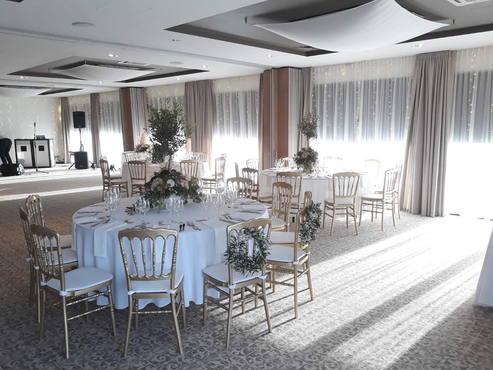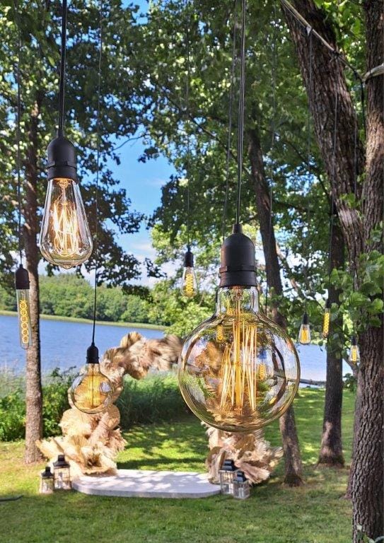 Šventėje dalyvaus iki 50 svečių? Siūlome EŽERO SALĘ. Tai atskiras pastatas ant ežero kranto su panoraminiais langais, kurie suteikia pojūtį tarytum švęstumėte lauke! Koks romantiškas vakaras, kai medžiai virš ežero pasipuošia lempučių girliandomis, o nuotraukose jaunieji saulei leidžiantis į ežerą. Kas gali būti romantiškiau?